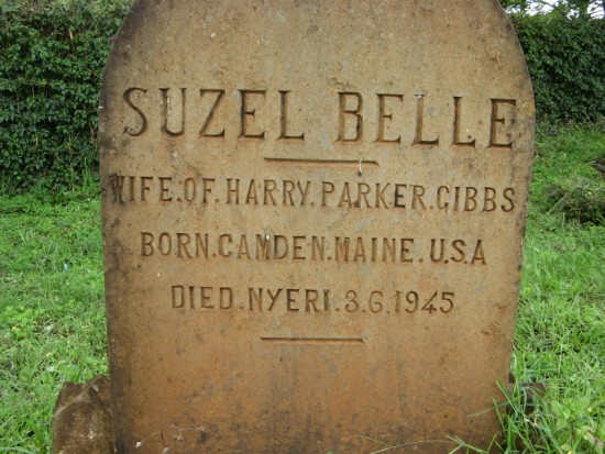 - Inscriptions:Suzel Belle / wife of Harry Parker Gibbs / born Camden, Maine, USA / died Nyeri 3.6.1945