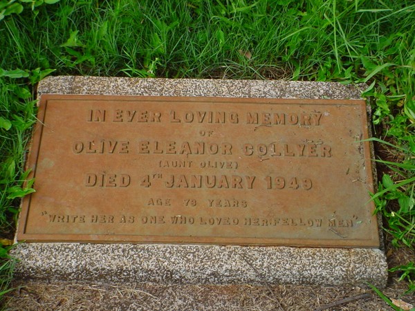 - Inscriptions:in ever loving memory / of / Olive Eleanor Collyer / (aunt Olive) Died 4th January 1949 / age 73 years / "write her as one who loved her fellow men"