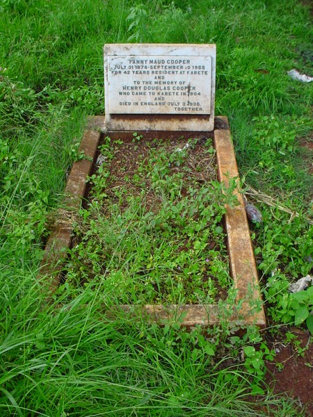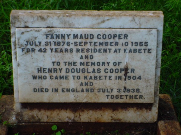 - Inscriptions:Fanny Maud Cooper / July 31 1876 - September 10 1955 / for 42 years resident at Kabete / and / to the memory of / Henry Douglas Cooper / who came to Kabete in 1904 / and / died in England July 3 1936 / together