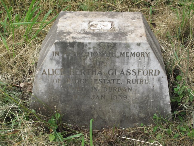 - Inscriptions:in affectionate memory / of / Alice Bertha Glassford / of Ridge Estate, Ruiru / died in Durban / 11th Jan 1939