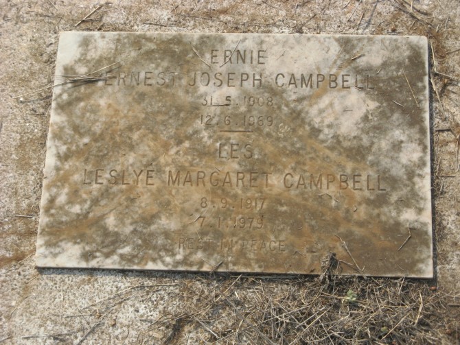 - Inscriptions:Ernie / Ernest Joseph Campbell / 31.5.1909 / 12.6.1969 / Les / Leslye Margaret Campbell / 8.9.1917 / 7.1.1979 / rest in peace