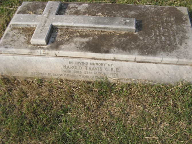 - Inscriptions:in loving memory of / Harold Travis C.B.E. / who died 23rd August 1976 / beloved husband of Molly and father of Christine and John