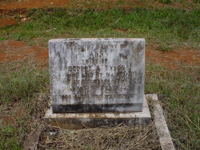 - Inscriptions:in loving memory of / Ann / wife of / Robert A Tyson / who died at Nairobi / 31st December 1968 / aged 59 years / God bless you my Pettie