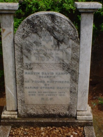 - Inscriptions:Malvin David Kampf / "Scampie" / he found happiness / by / making others happy / born 3rd October 1879 / died 16th August 1941 / R.I.P.
