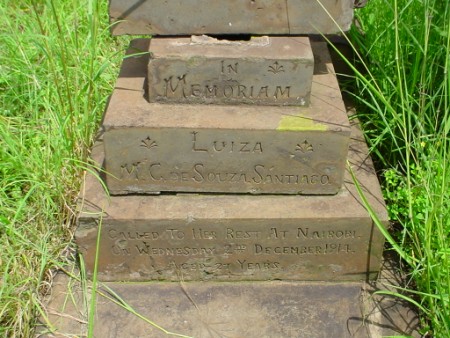 - Inscriptions:in memoriam / Luiza / M C de Souza Santiago / called to her rest at Nairobi / on Wednesday 2nd December 1914 / aged 27 years / mourn not friends and relatives dear / I am not dead but in another sphere / I was destined not for you alone / God called me early to make me his own / R.I.P.