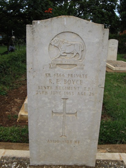 Inscriptions:KR 4366 Private / R E Boyce / Kenya Regiment (T.F.) / 25 June 1953 age 26 / abide with me