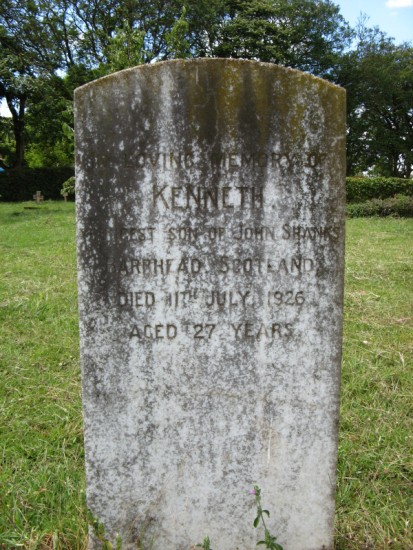 - Inscriptions:in loving memory of / Kenneth / youngest son of John Shanks / Barhead, Scotland / died 11th July 1926 / aged 27 years