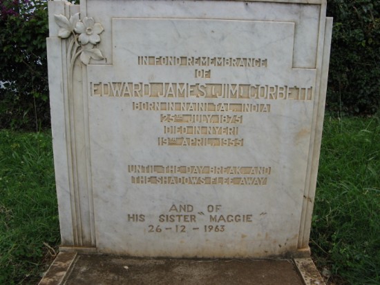 - Inscriptions:in fond remembrance / of / Edward James "Jim" Corbett / born in Naini Tal, India / 25th July 1875 / died in Nyeri / 19th April 1955 / until the day breaks and the shadows flee away / and of / his sister "Maggie" / 26.12.1963