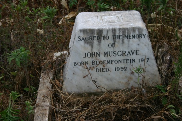 Inscriptions:sacred to the memory / of / John Musgrave / born Bloemfontein 1917 / died 1952